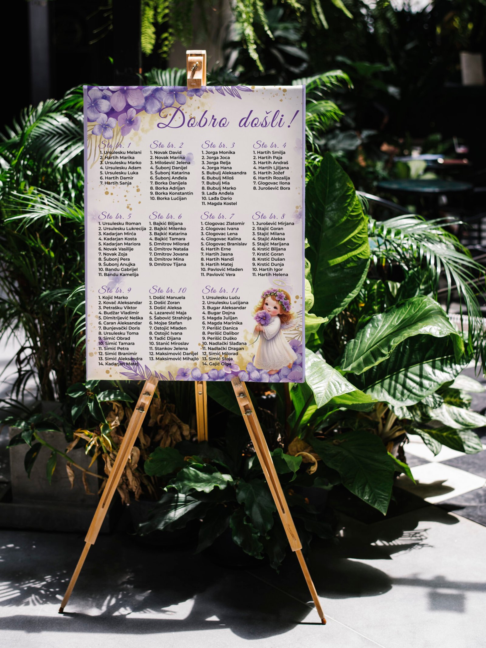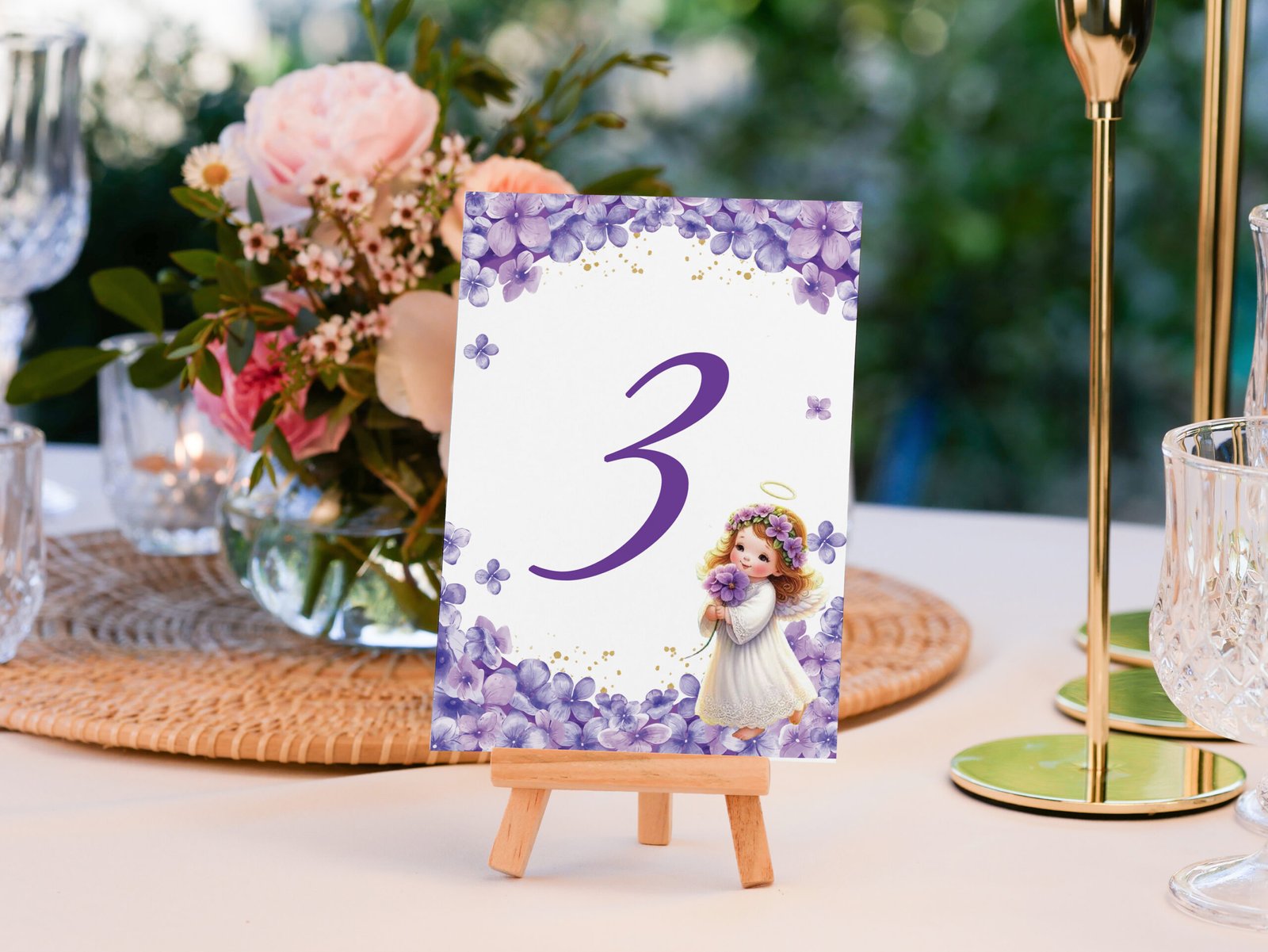 Dizajnirani su tematski rođendanski materijali u ljubičastim tonovima, sa ilustracijom anđela, prilagođeni dekoraciji i organizaciji prostora.